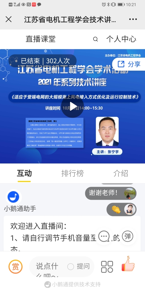 10月15日下午,江苏省电机工程学会举办2021年系列线上讲座第二十期——《适应于受端电网的大规模海上风电接入方式优化及运行控制技术》。讲座采用网络直播方式进行,特邀国网江苏电科院张宁宇博士主讲。省电机工程学会各会员单位、专工委会、学生分会以及省内有关电力能源企业相关专业人员共300余人次在线观看了本次讲座。