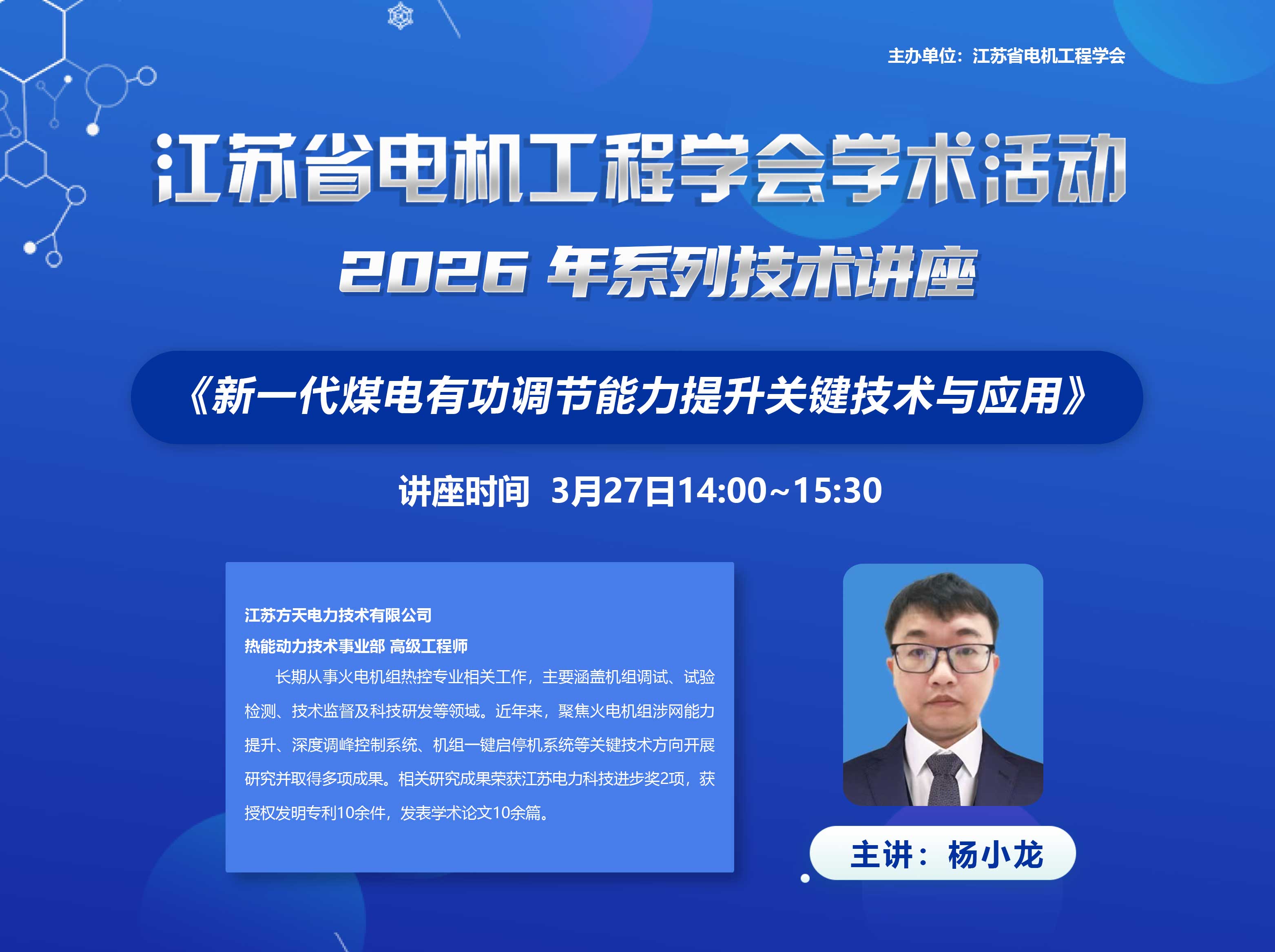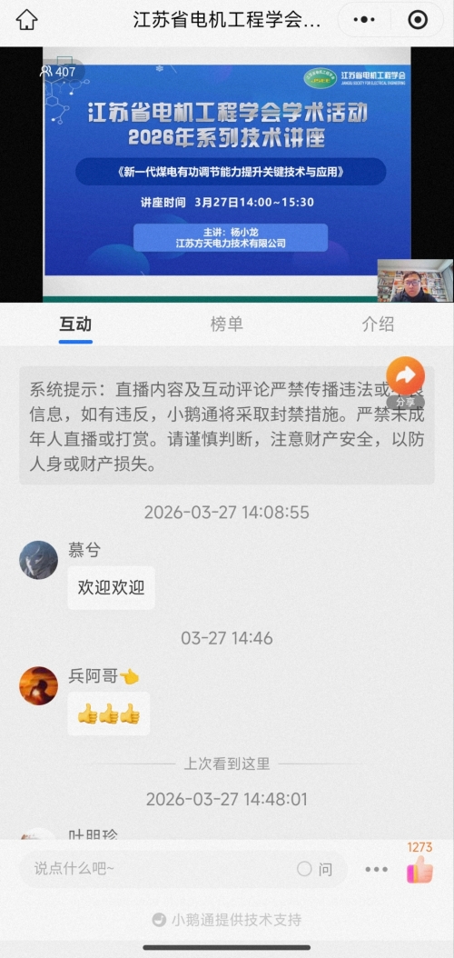 3月27日,省电机工程学会举办2026年第2期线上讲座。讲座邀请江苏方天电力技术有限公司杨小龙高工作《新一代煤电深度调峰有功调节能力提升关键技术与应用案例》报告。学会各会员单位、专工委会、学生分会以及省内有关电力能源企业相关专业人员400余人次在线观看了本次讲座。