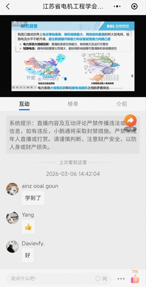 3月6日,省电机工程学会成功举办2026年第1期线上讲座。讲座邀请南京南瑞继保电气有限公司研究院经理吕玮作《基于快速开关的短路电流抑制技术及应用》报告。学会各会员单位、相关专委会及省内外电力能源领域专业人员800余人在线观看了本次讲座。